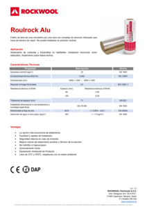 Fieltro de lana de roca revestido por una de sus caras con un revestimiento de aluminio reforzado que atúa como barrera de vapor. No puede instalarse en posición vertical. Aislamiento térmico y acústico de cubiertas y buhardillas no habitables. Instalación horizontal entre tabiquillos. Aislamiento sobre falsos techos.
